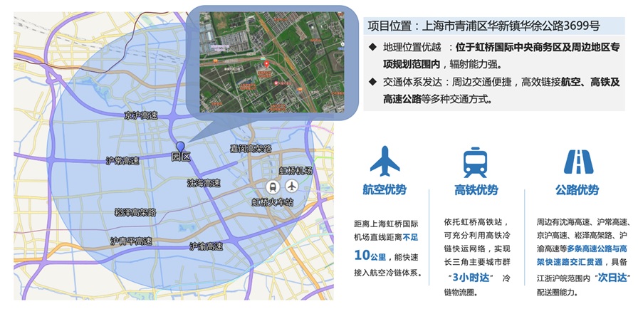 光明冷链西虹桥产业园拥有优越的区位位置,地处长三角核心区域、上海西大门交通要道,紧邻西虹桥国际商务区,拥有便捷立体交通网络。毗邻沪常高速、沈海高速、沪渝高速、京沪高速等多条干道,同时位于上海市中心市区1小时经济圈范围内、具备服务上海,辐射长三角的天然区位优势。
